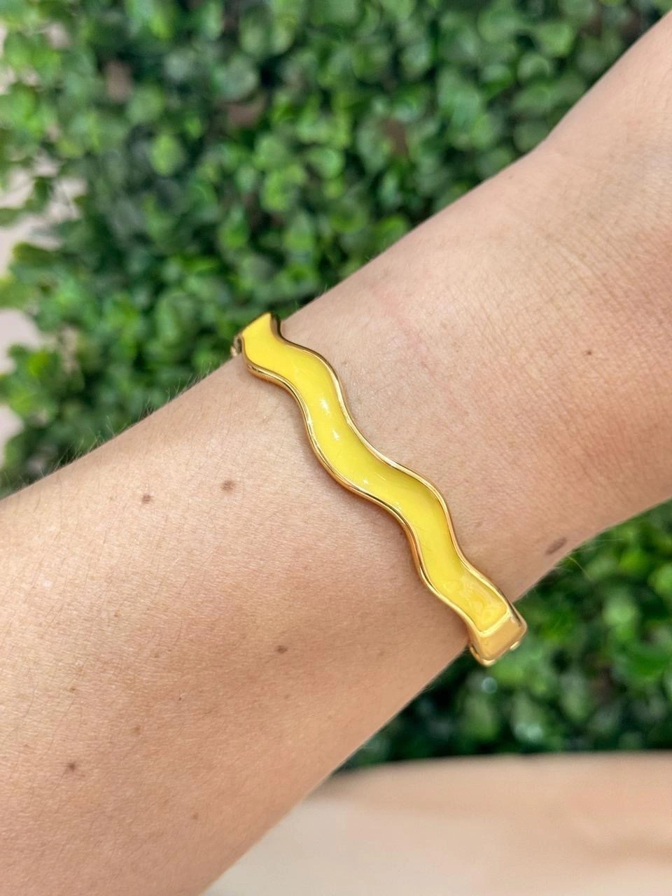 Bracelete onda com Resina Amarelo. Uma peça linda para compor seu mix de pulseiras, resultando num mix super delicado. Aposte nessa ideia!